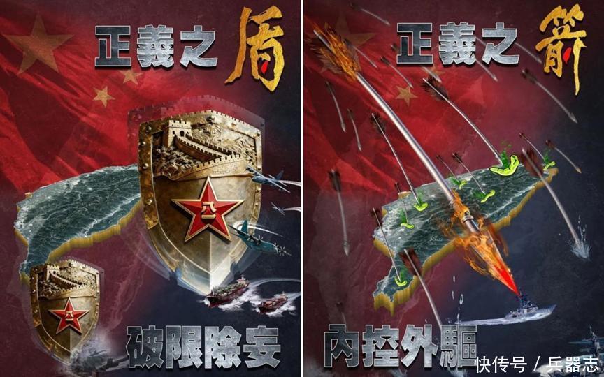 在《正义之盾》的海报上,中国国旗与铸造的两枚盾牌象征着无形的保护与坚定的决心。盾牌的刀锋形状不仅意味着防御,也暗示着反击的态势。此时的美国则被暗示为这场战斗中的“客串角色”,美军的各种先进装备赫然出现在画面上,仿佛预示它们将遭遇严厉的反击。面对美国政府不断增加的对台军售,此次展示显然具有强烈的威慑意味。